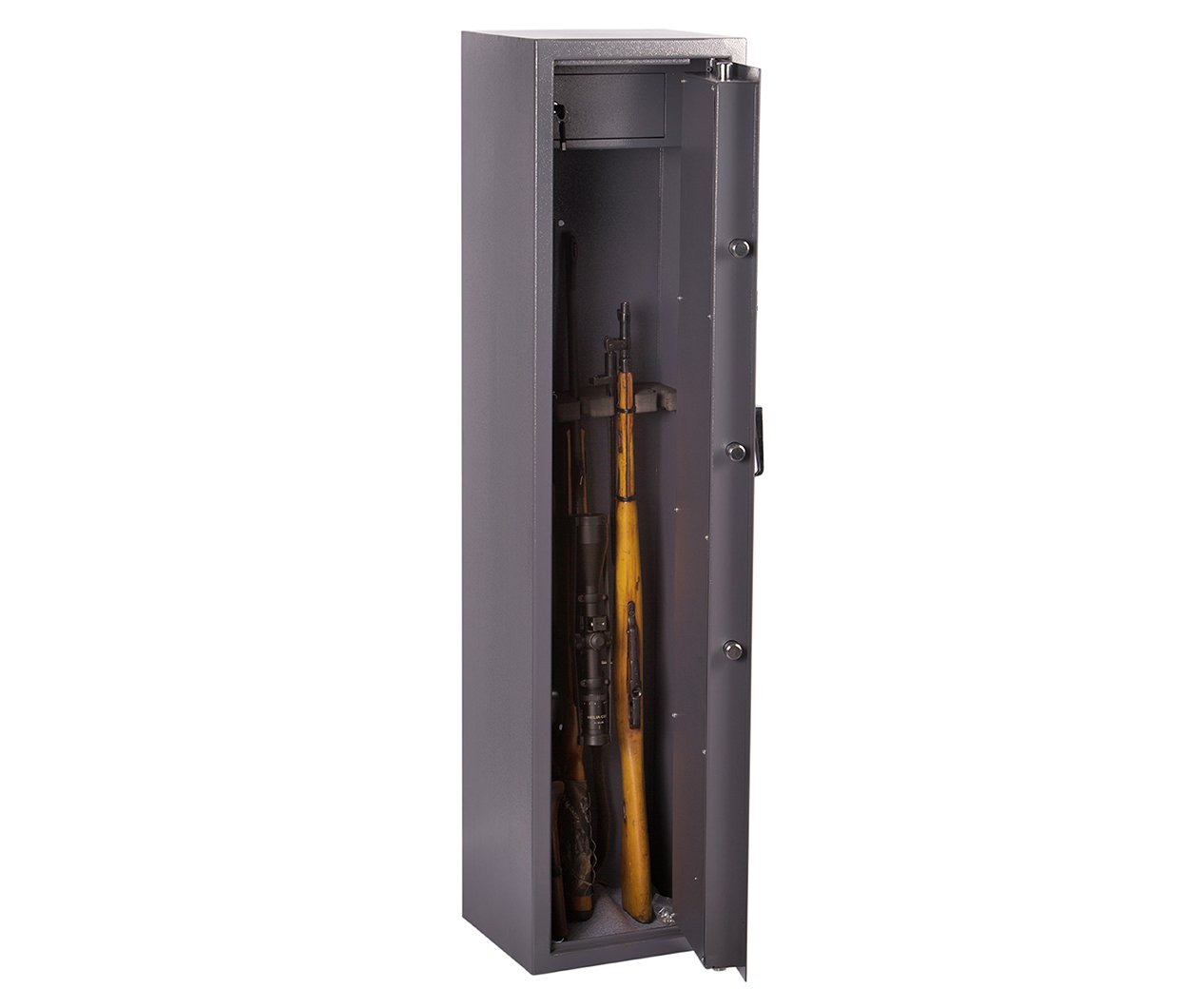 Brihard Hunter 5 E – patikimas seifas, skirtas iki 5 šautuvų saugojimui. Atitinka Lietuvos Respublikos reikalavimus ginklų laikymui ir užtikrina aukštą saugumo lygį tiek medžiotojams, tiek sportinių ginklų savininkams.