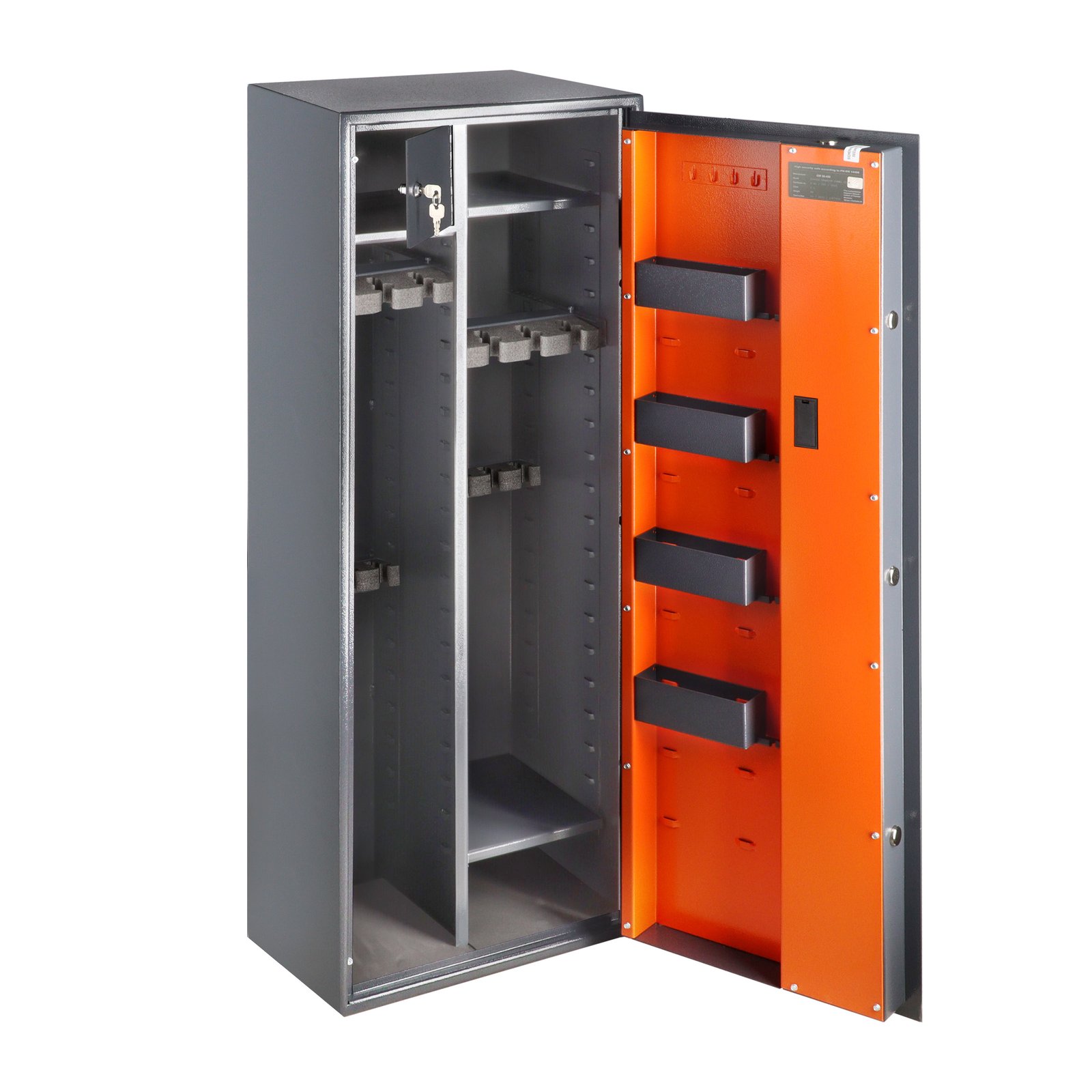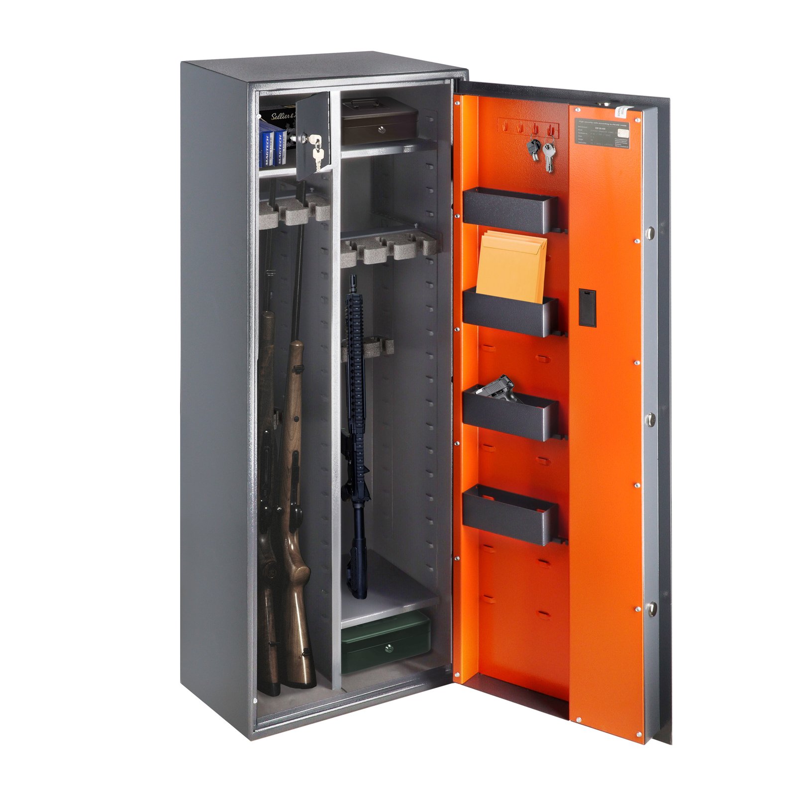 Brihard Hunter Premium Combi 12 E – sertifikuotas (EN 14450 – S1 klasė) ginklų seifas, skirtas ilgiems ir trumpiems ginklams bei amunicijai laikyti. Talpus, patikimas ir pritaikomas pagal individualius poreikius.