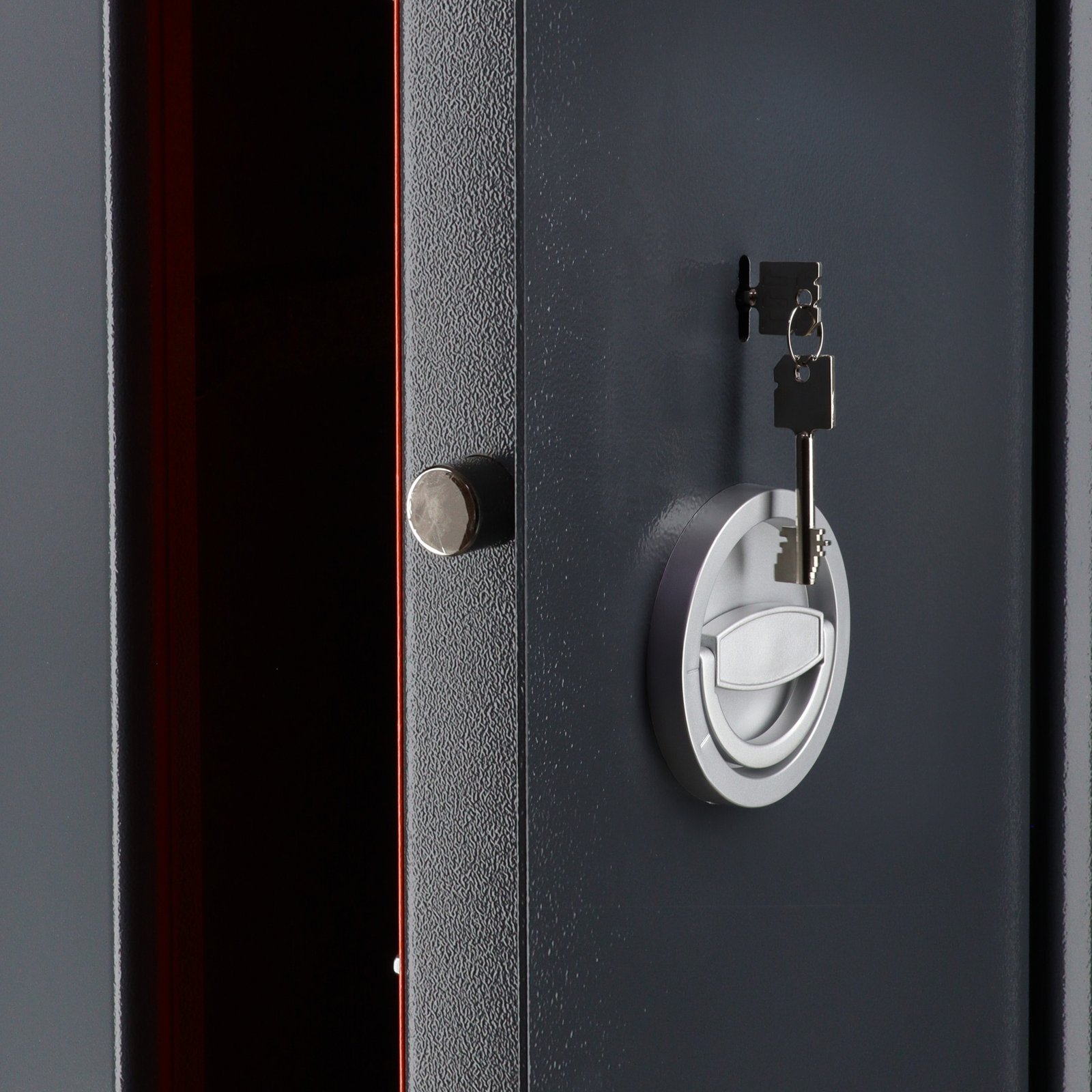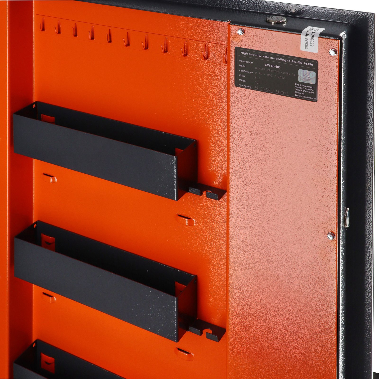 Patogumas: išoriniai vyriai leidžia atidaryti duris 180°. Vidinė durų pusė – ryškiai oranžinė (RAL 2004), primenanti apie būtinybę uždaryti seifą.