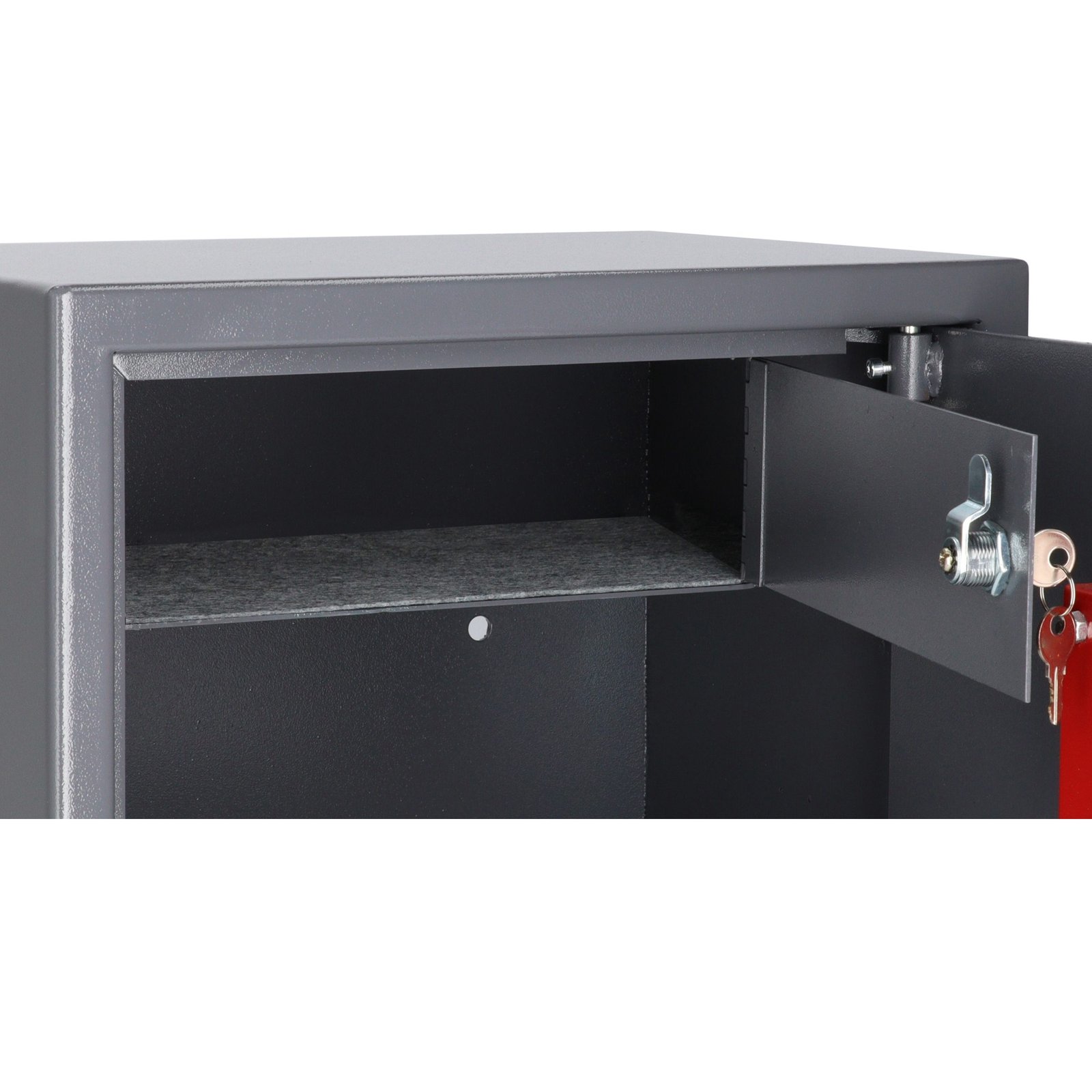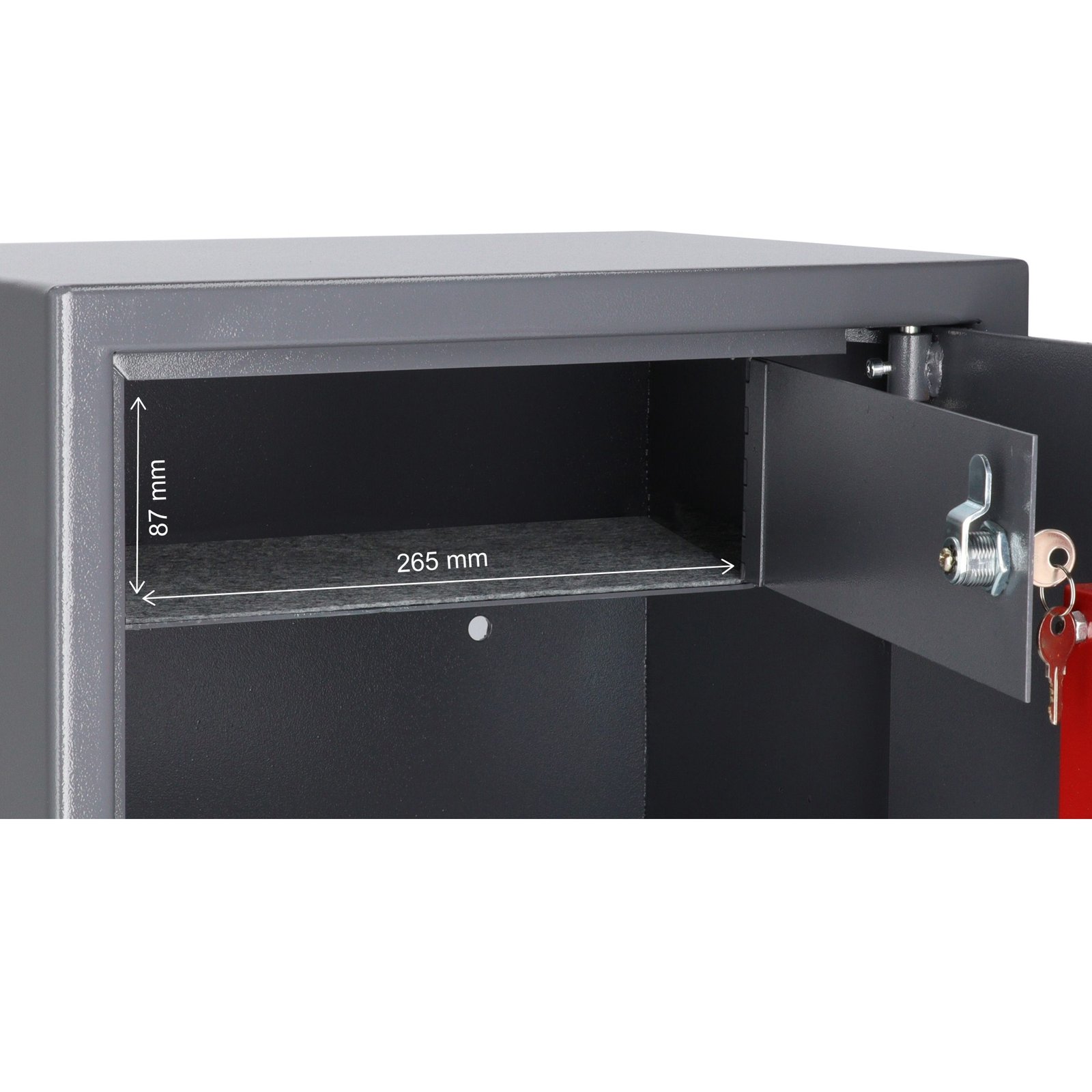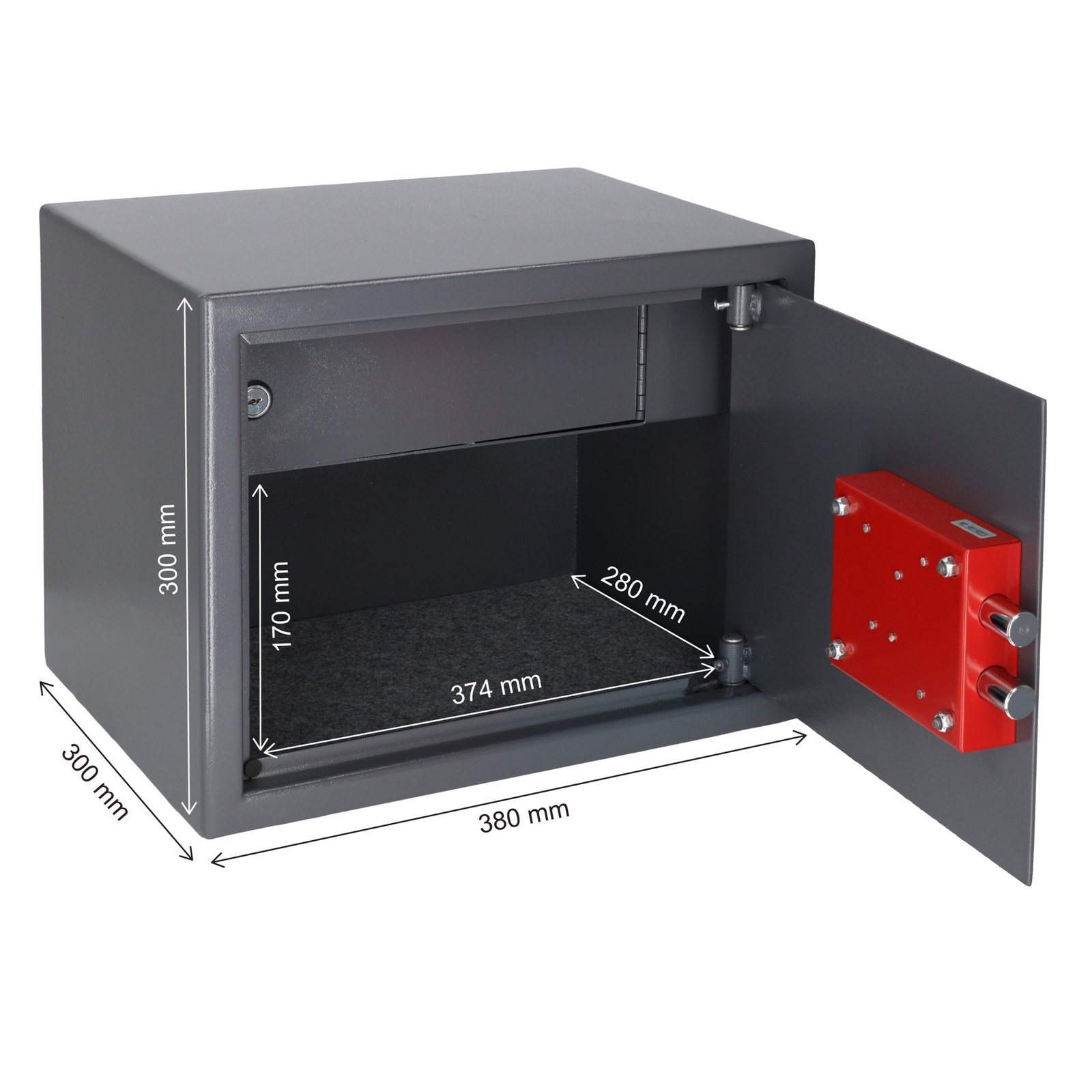 Tvirtinimas: seifą būtina pritvirtinti gamintojo numatytuose taškuose. Galinėje sienelėje ir dugne yra kiaurymės (8 mm), komplekte – plečiami tvirtinimo varžtai.