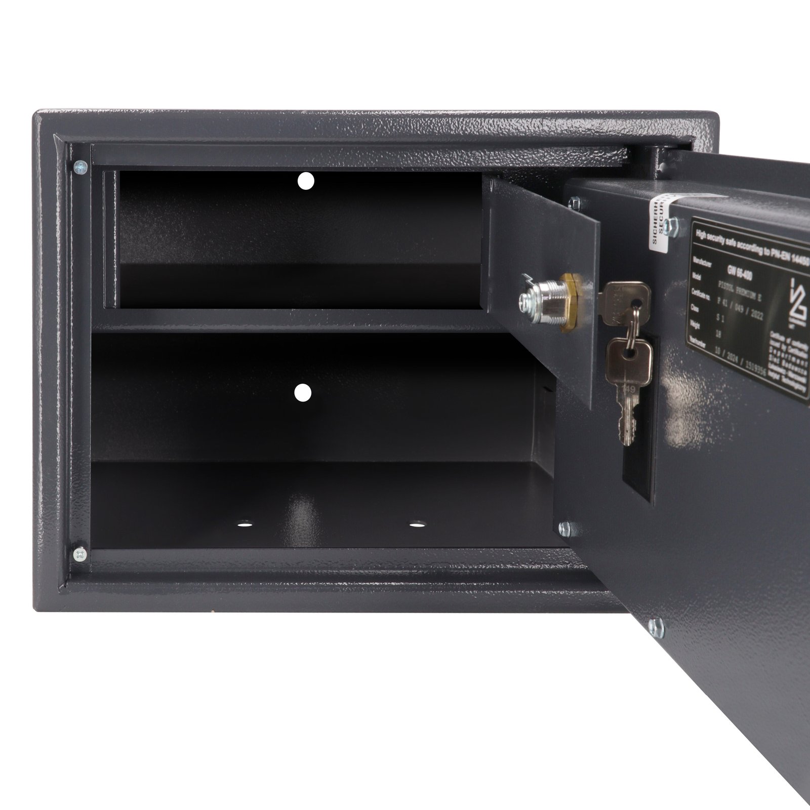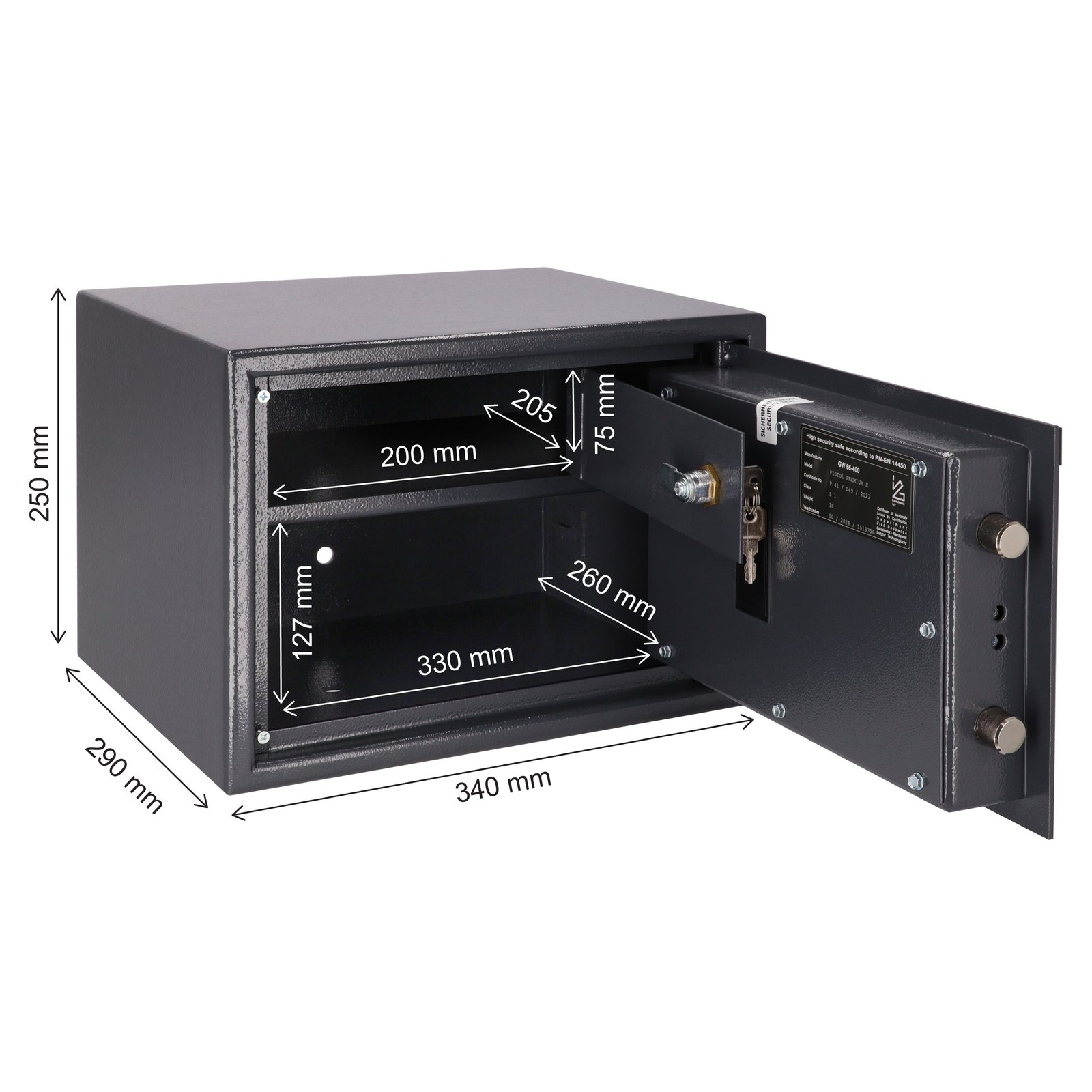 Spyna: elektroninė II (B) klasės „Stellar Basic“, sertifikuota VdS-Köln pagal EN 1300:2004-06. Spynos mechanizmas apsaugotas manganinio plieno plokštele. Maitinimas – 9 V šarminė baterija.