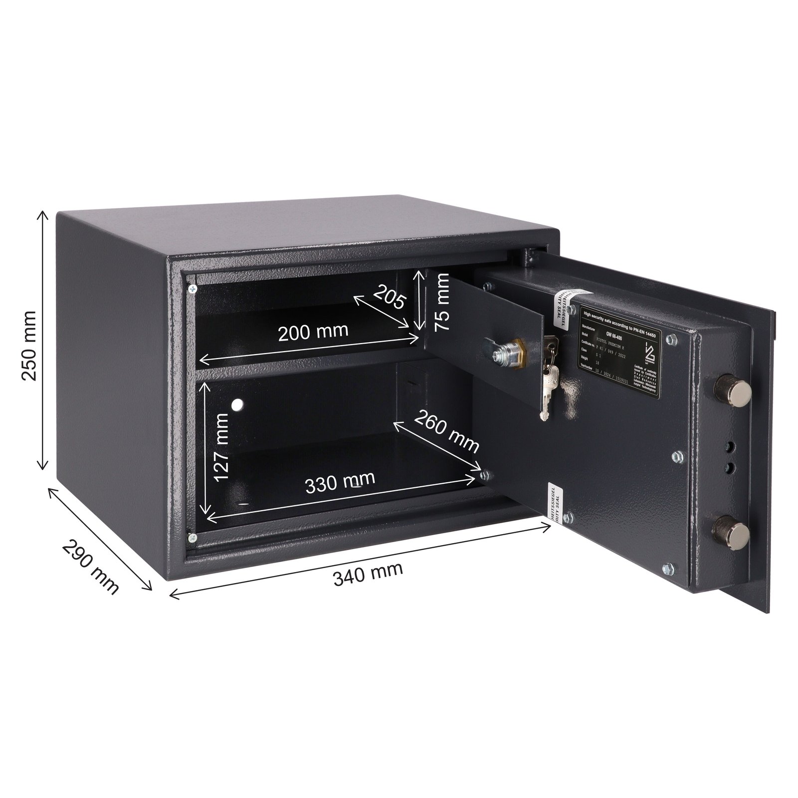 Spyna: sertifikuotas aukštos saugumo I (A) klasės VdS raktinis užraktas (65 mm) su dviem raktais. Spynos mechanizmas papildomai apsaugotas manganinio plieno plokštele.