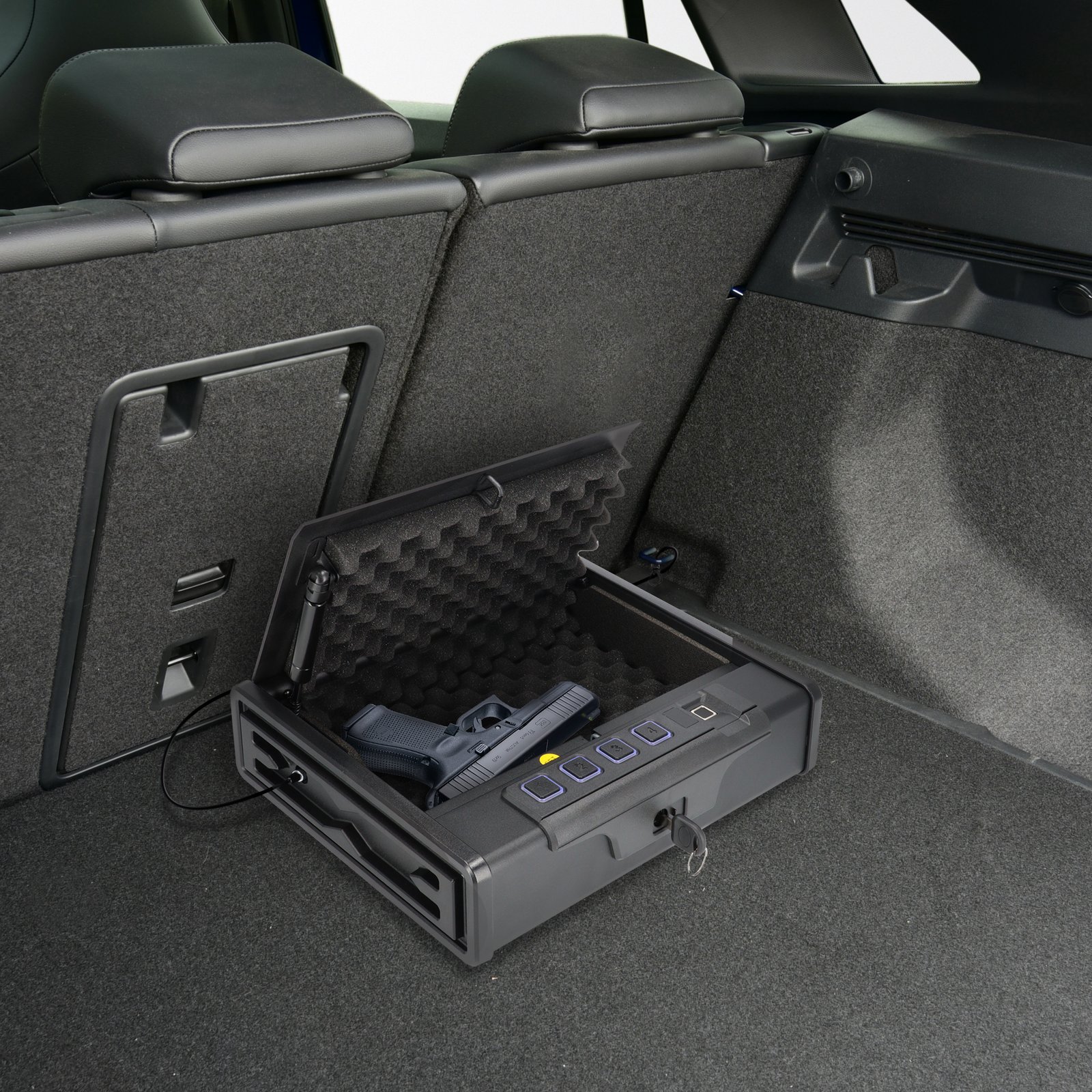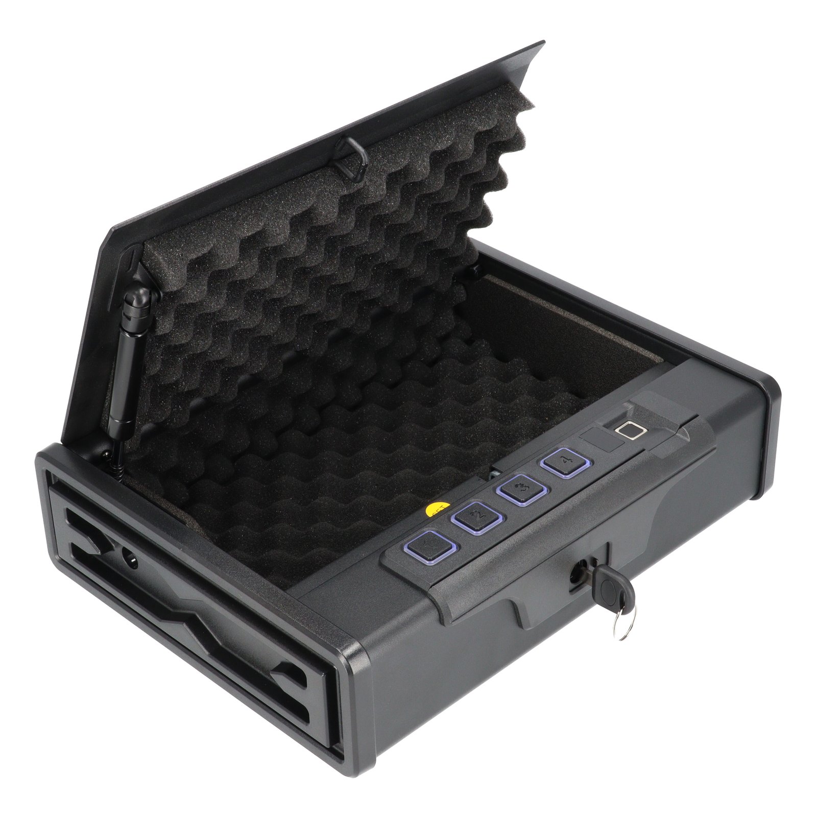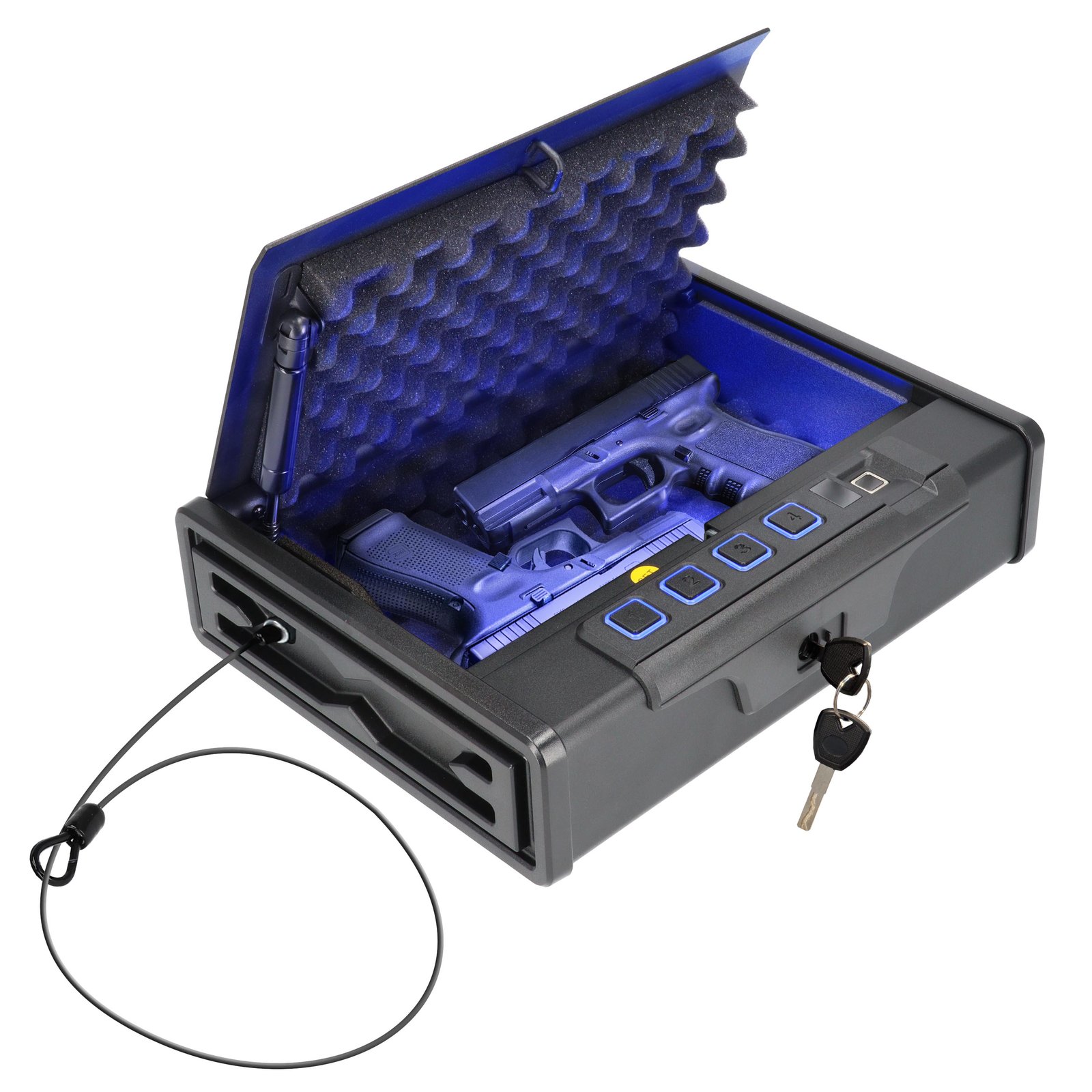 3 atrakinimo būdai: biometrinis piršto atspaudas (galima užprogramuoti iki 20 vartotojų), kodinė spyna (4–6 skaičių PIN), avarinis raktas.